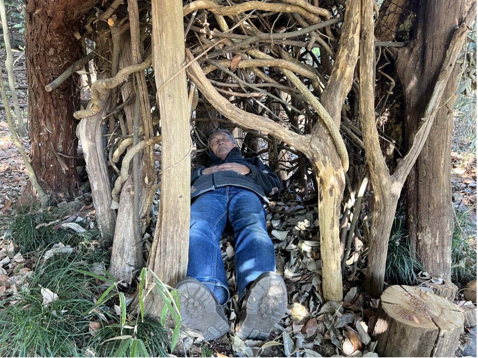 プープランドには元々そこにあった枯木を活用して作った、数々の手作りのベンチやベッド、シーソー、丸太道などがありますが、特に自慢の傑作が“鳥の巣テラス”です。そしてその下には、木に包まれて寝転べるスポットもつくりました。